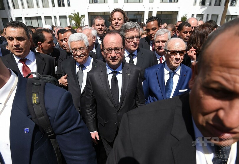行進にはまた、チュニジアのベジ・カイドセブシ(Beij Caid Essebsi)大統領の他、フランスのフランソワ・オランド(Francois Hollande)大統領、イタリアのマッテオ・レンツィ(Matteo Renzi)首相、パレスチナ自治政府のマフムード・アッバス(Mahmud Abbas)議長を含む各国の首脳らも参加した。(c)AFP/Kaouther Larbi