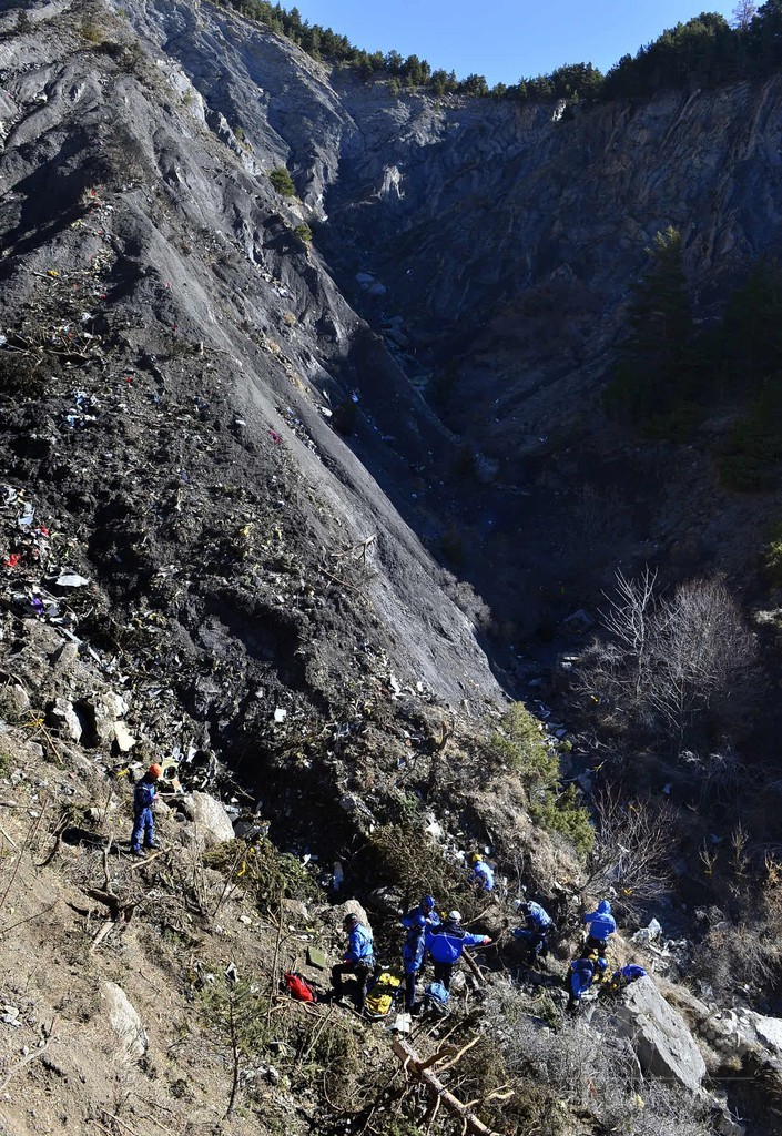 同便は時速700キロで山腹に激突したとされており、警察の犯罪研究所幹部パトリック・トゥロン(Patrick Touron)氏は「無傷の遺体は全くない」としている。現場は40~60度の急斜面で、落石の危険もあり、捜索活動の難易度は「前例のない」ものとなっているという。