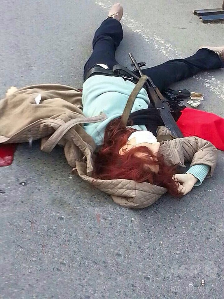 トルコ・イスタンブールの警察本部近くの路上に横たわる武装した女の遺体(2015年4月1日撮影)。(c)AFP/IHLAS NEWS AGENCY
