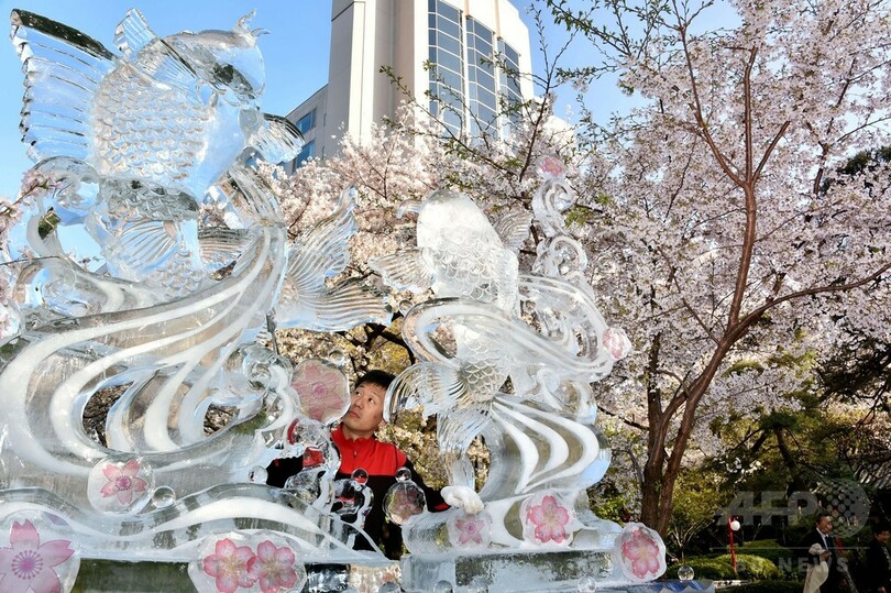 【4月3日 AFP】桜が満開となった都内のグランドプリンスホテル高輪の庭で2日、氷の彫刻家、小阪芳史(Yoshihito Kosaka)さんによる氷の彫刻が披露された。「鯉の滝登り」がモチーフ。小阪さんは、国内外の大会で数々の優勝経験がある。(c)AFP