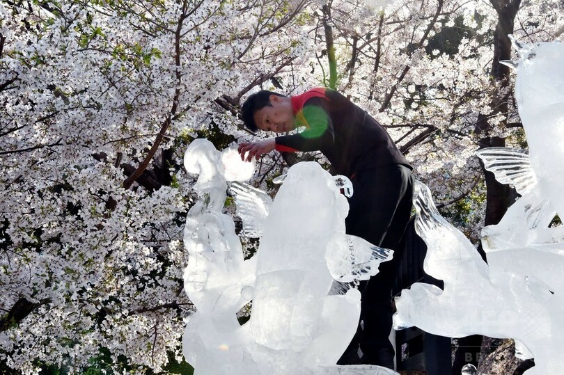 【4月3日 AFP】桜が満開となった都内のグランドプリンスホテル高輪の庭で2日、氷の彫刻家、小阪芳史(Yoshihito Kosaka)さんによる氷の彫刻が披露された。「鯉の滝登り」がモチーフ。小阪さんは、国内外の大会で数々の優勝経験がある。(c)AFP