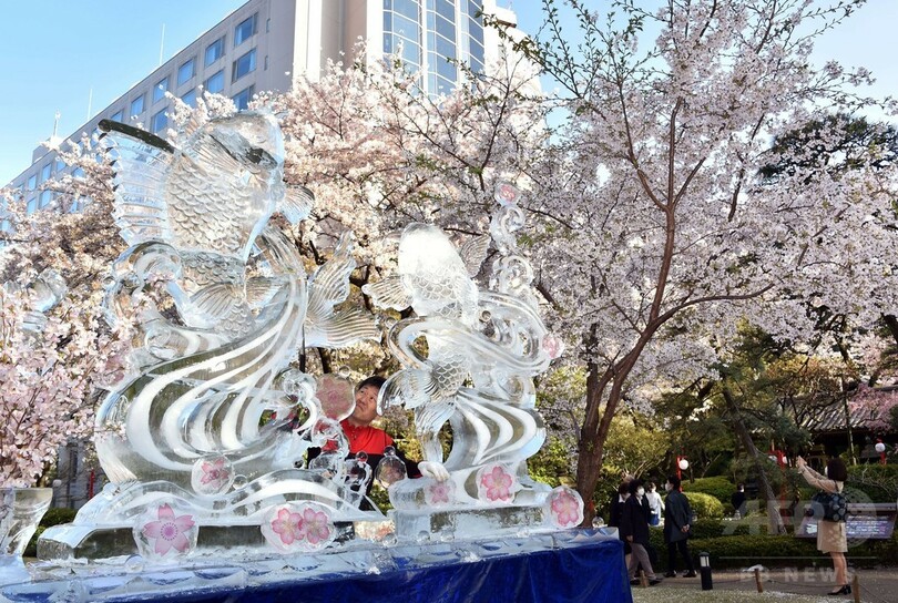 【4月3日 AFP】桜が満開となった都内のグランドプリンスホテル高輪の庭で2日、氷の彫刻家、小阪芳史(Yoshihito Kosaka)さんによる氷の彫刻が披露された。「鯉の滝登り」がモチーフ。小阪さんは、国内外の大会で数々の優勝経験がある。(c)AFP