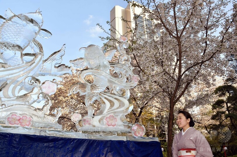 【4月3日 AFP】桜が満開となった都内のグランドプリンスホテル高輪の庭で2日、氷の彫刻家、小阪芳史(Yoshihito Kosaka)さんによる氷の彫刻が披露された。「鯉の滝登り」がモチーフ。小阪さんは、国内外の大会で数々の優勝経験がある。(c)AFP