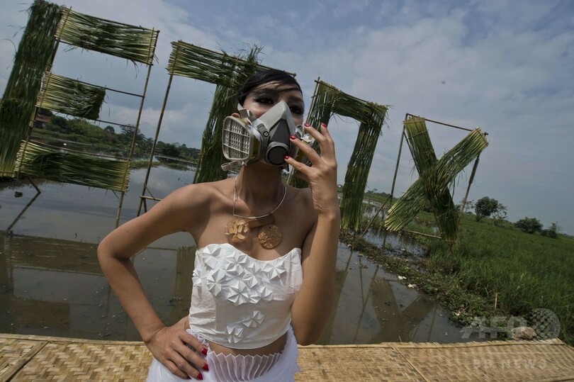 ファッションショーにガスマスク、環境破壊を告発 インドネシア