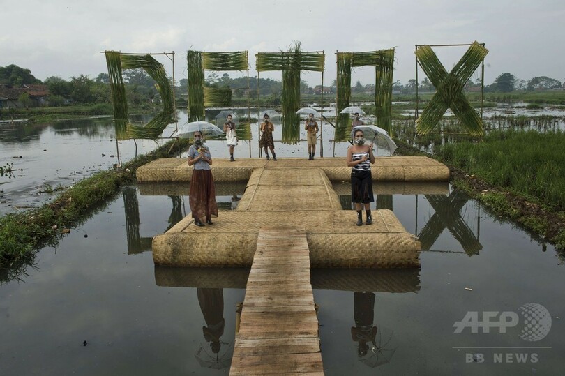 ごみの浮く水田に囲まれたステージで行われたショーは、国際環境保護団体グリーンピース(Greenpeace)と地元のデザイナーらが共同で開催した。