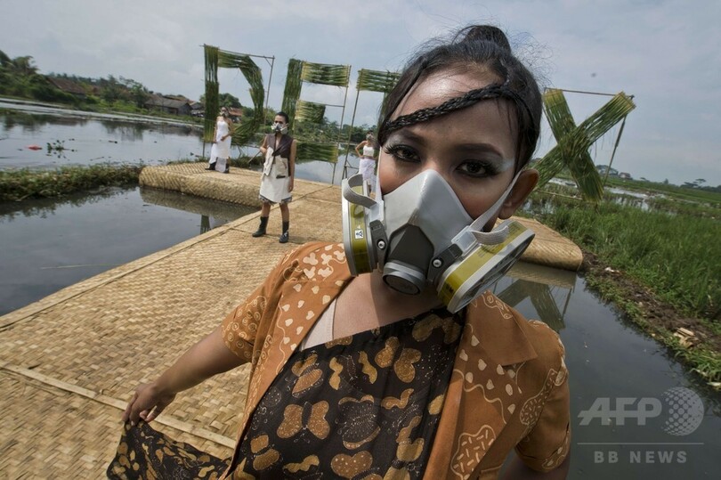 ファッションショーにガスマスク、環境破壊を告発 インドネシア