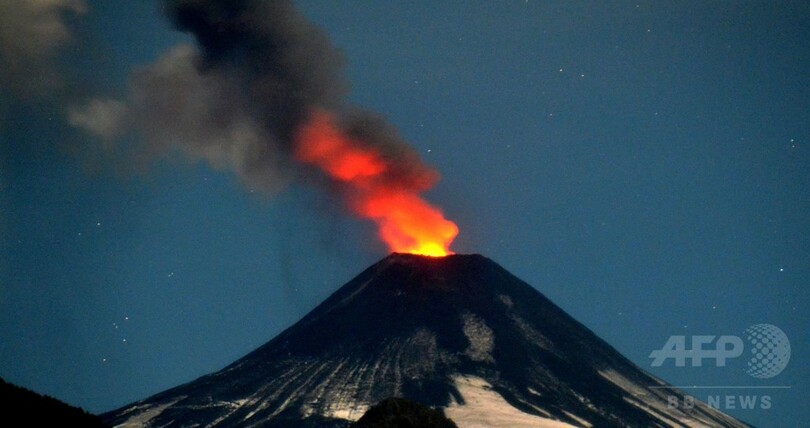 夜空に噴き上がる溶岩、チリのビジャリカ山