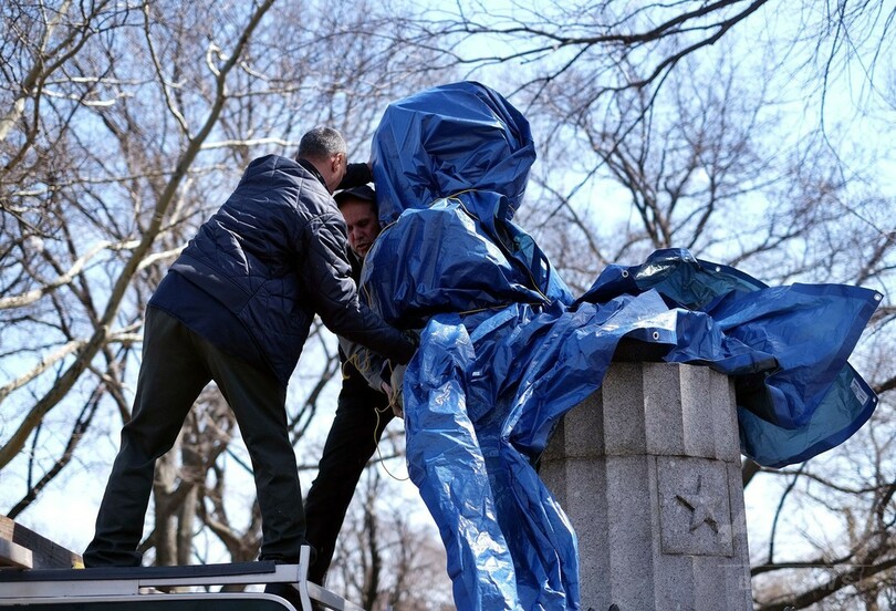 胸像は、石こう製で重さ約45キロ。違法に設置されたものであったため、当局が正午までブルーシートで覆った後、撤去した。(c)AFP