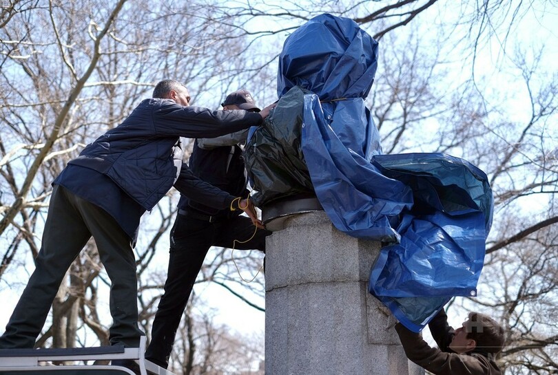 胸像は、石こう製で重さ約45キロ。違法に設置されたものであったため、当局が正午までブルーシートで覆った後、撤去した。(c)AFP