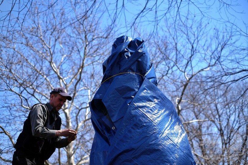 胸像は、石こう製で重さ約45キロ。違法に設置されたものであったため、当局が正午までブルーシートで覆った後、撤去した。(c)AFP