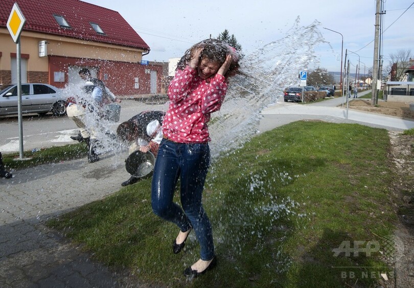 【4月7日 AFP】スロバキア北西部のトレンチアンスカテプラ(Trencianska Tepla)村で6日、男性らが若い女性にバケツに入った水をかけ柳の枝で叩く伝統行事が行われた。