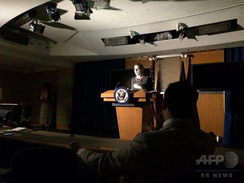 国務省は、記者会見の最中に停電にみまわれ、報道官が携帯電話の光を使って原稿を読み上げ、会見を続行した。(c)AFP/Jenny VAUGHAN