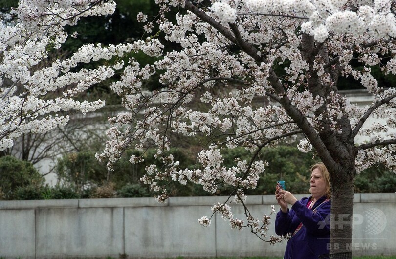 同公園に面するタイダルベイスン(Tidal Basin)の周りには、1912年に友好の印として日本から寄贈された桜があり、同日は桜の並木道を散歩したり写真撮影をしたりする人々の姿が見られた。(c)AFP