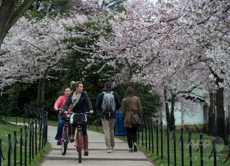 同公園に面するタイダルベイスン(Tidal Basin)の周りには、1912年に友好の印として日本から寄贈された桜があり、同日は桜の並木道を散歩したり写真撮影をしたりする人々の姿が見られた。(c)AFP