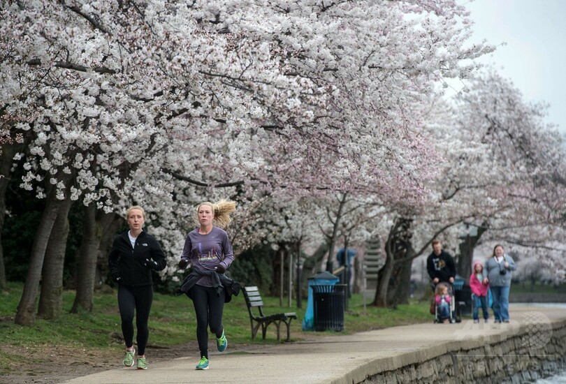 同公園に面するタイダルベイスン(Tidal Basin)の周りには、1912年に友好の印として日本から寄贈された桜があり、同日は桜の並木道を散歩したり写真撮影をしたりする人々の姿が見られた。(c)AFP