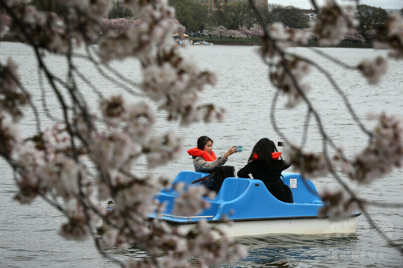 同公園に面するタイダルベイスン(Tidal Basin)の周りには、1912年に友好の印として日本から寄贈された桜があり、同日は桜の並木道を散歩したり写真撮影をしたりする人々の姿が見られた。(c)AFP