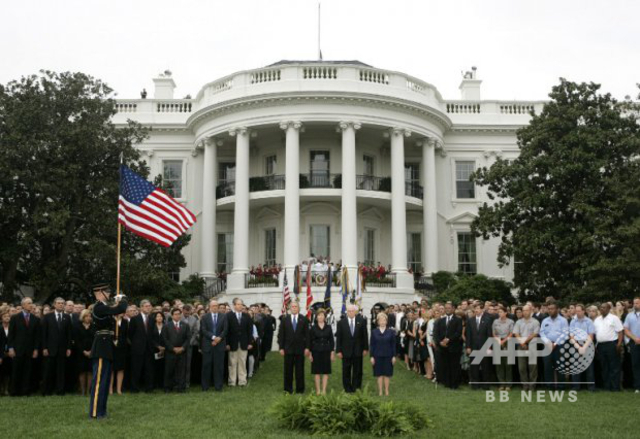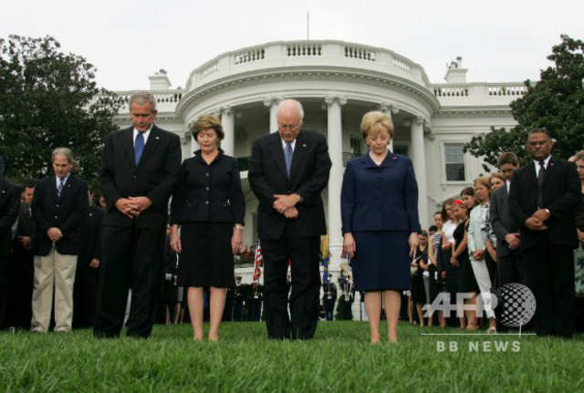 米ワシントンD.C.のホワイトハウス前で黙とうをささげるジョージ・W・ブッシュ大統領、ローラ・ブッシュ大統領夫人、ディック・チェイニー副大統領、リン・チェイニー副大統領夫人(2007年9月11日撮影)。(c)AFP/SAUL LOEB