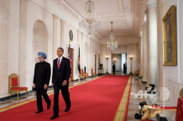 米ワシントンD.C.のホワイトハウスでインドのマンモハン・シン首相と共同記者会見に臨むバラク・オバマ米大統領(2009年11月24日撮影)。(c)AFP/Saul LOEB