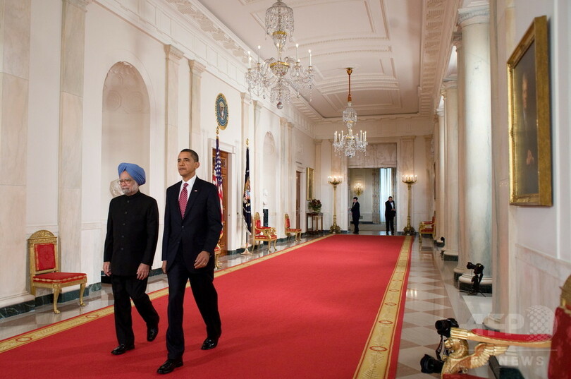 インドのマンモハン・シン(Manmohan Singh)首相(当時)が訪米したときには、オバマ大統領と一緒に共同会見に向かう姿を撮影するためにリモートカメラを使用したが、これには通路脇に置かれた他のリモートカメラも写っているのが分かるだろう。(c)AFP/Saul Loeb