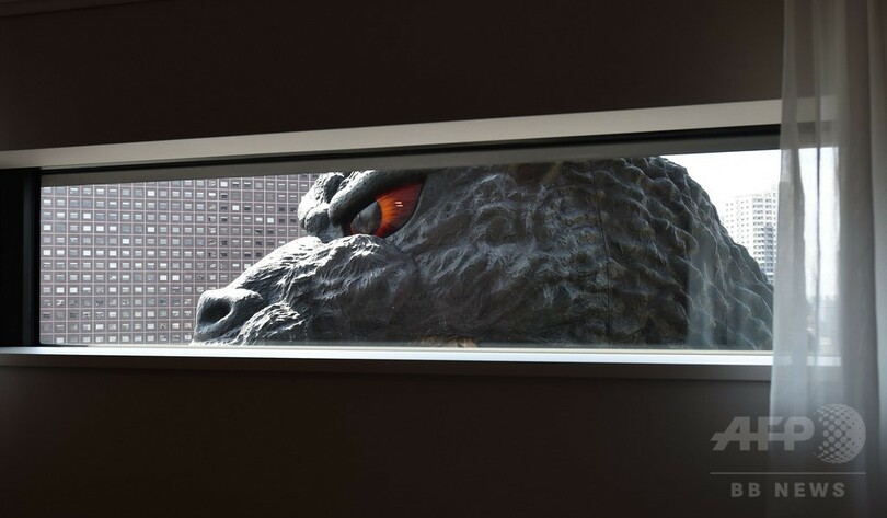 同ホテルでは、客室の窓から「実物大」のゴジラの頭部が見える「ゴジラビュールーム」や、ゴジラの関連グッズを集めた「ゴジラルーム」などを用意している。複合施設にはレストランや映画館なども入る。(c)AFP