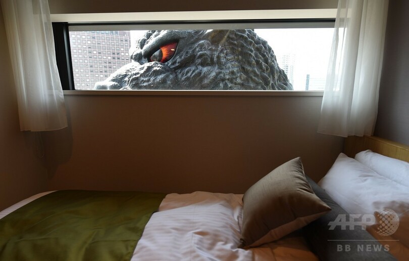 同ホテルでは、客室の窓から「実物大」のゴジラの頭部が見える「ゴジラビュールーム」や、ゴジラの関連グッズを集めた「ゴジラルーム」などを用意している。複合施設にはレストランや映画館なども入る。(c)AFP