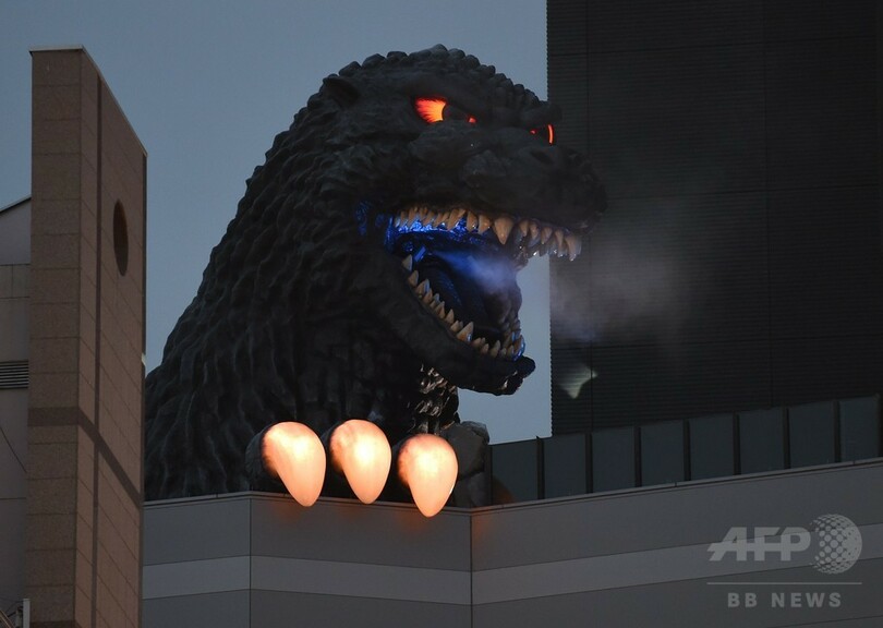 【4月9日 AFP】東京・歌舞伎町で9日、「実物大」のゴジラの頭部がお披露目された。イベントではゴジラが口から煙を吐く様子も見られた。