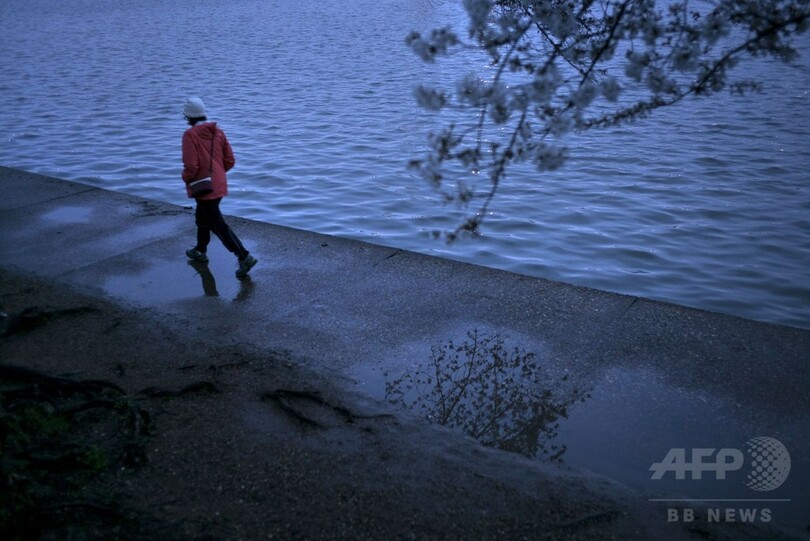 【4月10日 AFP】】米首都ワシントン(Washington D.C.)の国立公園ナショナルモール(National Mall)で見ごろを迎えた桜。早朝には朝焼けに美しいシルエットが浮かび上がる。
