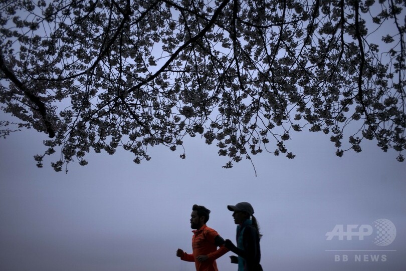 【4月10日 AFP】】米首都ワシントン(Washington D.C.)の国立公園ナショナルモール(National Mall)で見ごろを迎えた桜。早朝には朝焼けに美しいシルエットが浮かび上がる。