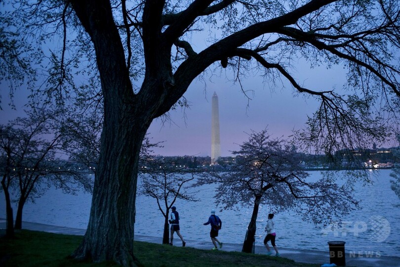 【4月10日 AFP】】米首都ワシントン(Washington D.C.)の国立公園ナショナルモール(National Mall)で見ごろを迎えた桜。早朝には朝焼けに美しいシルエットが浮かび上がる。