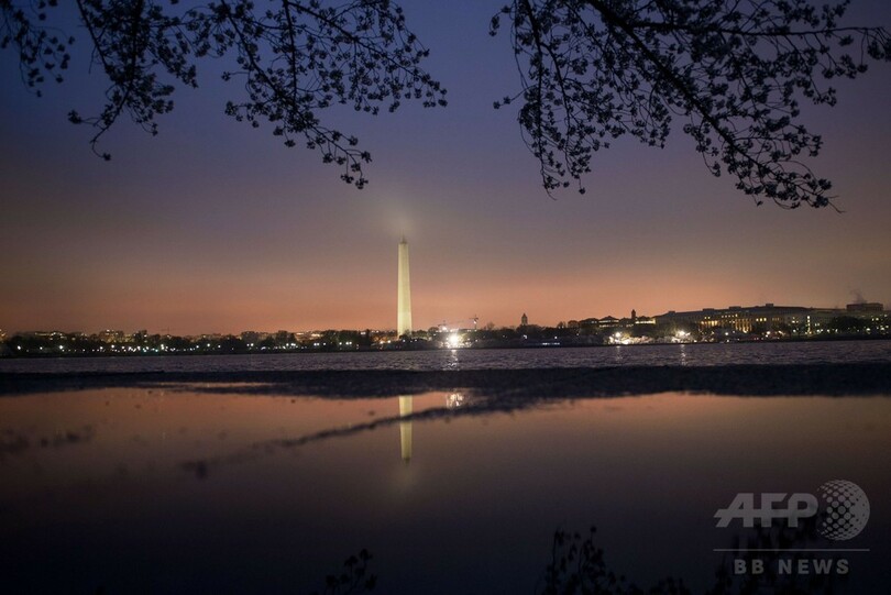 【4月10日 AFP】】米首都ワシントン(Washington D.C.)の国立公園ナショナルモール(National Mall)で見ごろを迎えた桜。早朝には朝焼けに美しいシルエットが浮かび上がる。