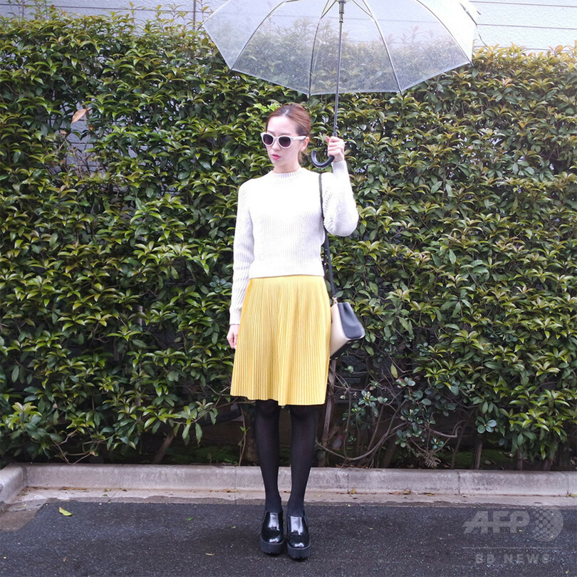 薄グレーのニット、イエローのスカートに、METROCITYのバイカラーバッグをコーディネートしてカラーで春を意識。