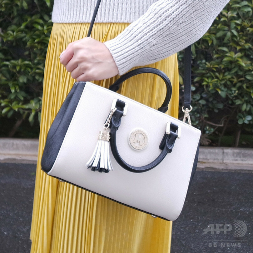 薄グレーのニット、イエローのスカートに、METROCITYのバイカラーバッグをコーディネートしてカラーで春を意識。