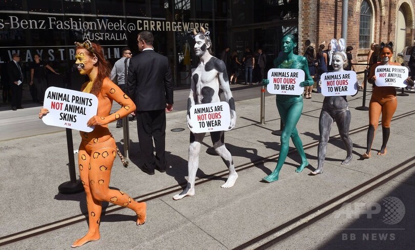 【4月14日 AFP】13日、国際動物愛護団体、PETA(People for the Ethical Treatment of Animals)のメンバーが、「15/16年春夏オーストラリア・ファッションウィーク」 の会場の外でデモを行った。