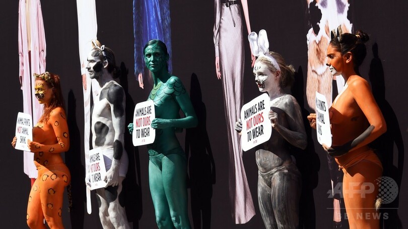 このデモでPETAのメンバーは、革やウールなど、動物の毛皮をファッションに使うのを辞めるように訴えた。(c)AFP