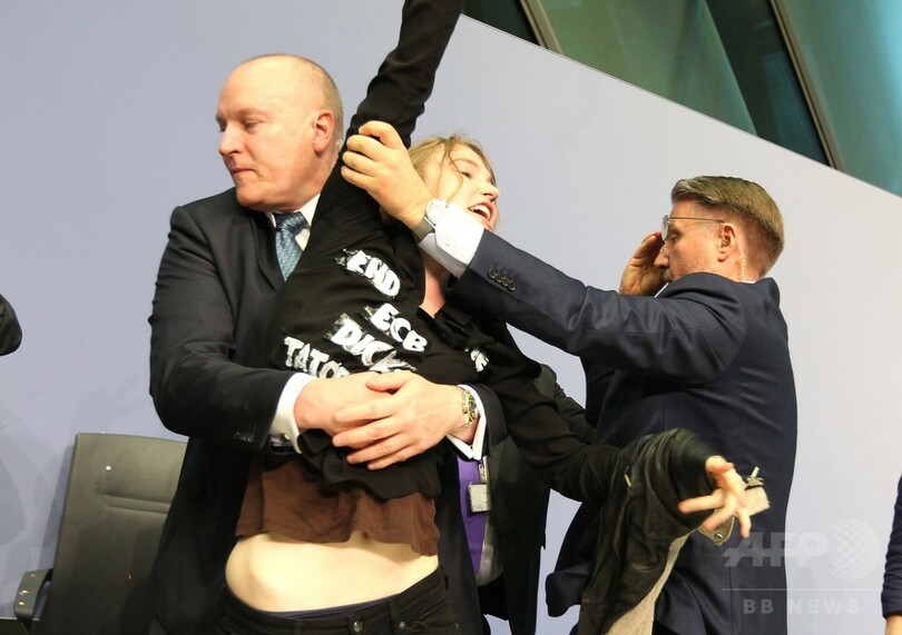 「DICTATORSHIP(独裁)」のつづりを「DICK-TATORSHIP」と変えて書いたTシャツを着た女性は、ドラギ総裁の前の机に飛び乗って紙ふぶきなどをまき散らしたが、すぐに取り押さえられ、会見は再開された。