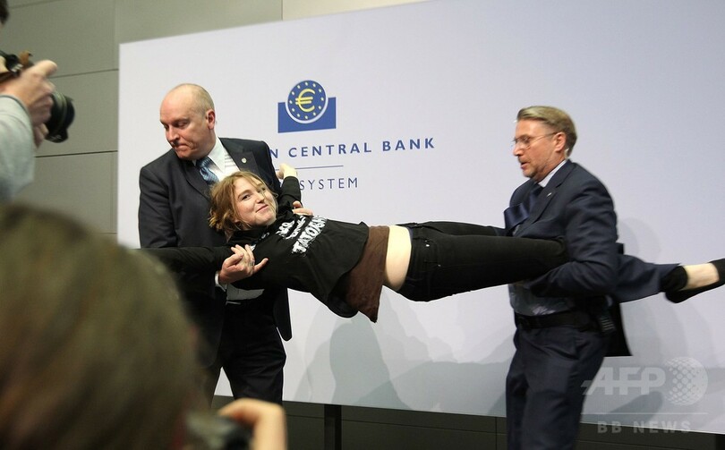 【4月16日 AFP】ドイツ・フランクフルト(Frankfurt)の欧州中央銀行(ECB)新本部で15日、マリオ・ドラギ(Mario Draghi)総裁の記者会見中に若い女性が乱入し、「ECBの独裁を終わらせろ」などと叫んで会見を一時中断させる騒ぎがあった。