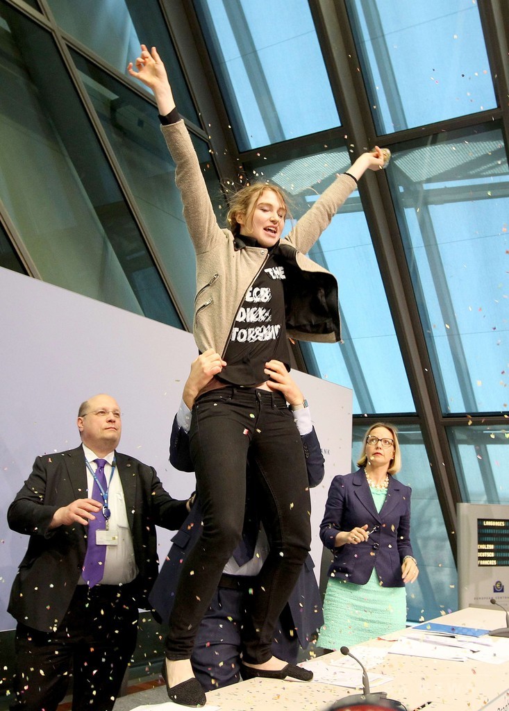ECBの声明によると、女性は実際には所属していない報道機関の記者を名乗って会見場に入り込んでいた。トップレス抗議で知られる女性権利団体「FEMEN」が後に、女性は同団体のメンバーだと発表した。(c)AFP