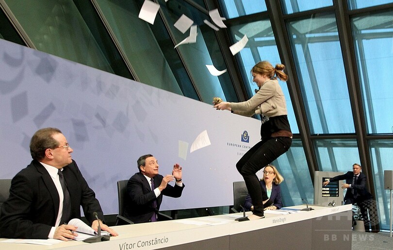 【4月16日 AFP】ドイツ・フランクフルト(Frankfurt)の欧州中央銀行(ECB)新本部で15日、マリオ・ドラギ(Mario Draghi)総裁の記者会見中に若い女性が乱入し、「ECBの独裁を終わらせろ」などと叫んで会見を一時中断させる騒ぎがあった。