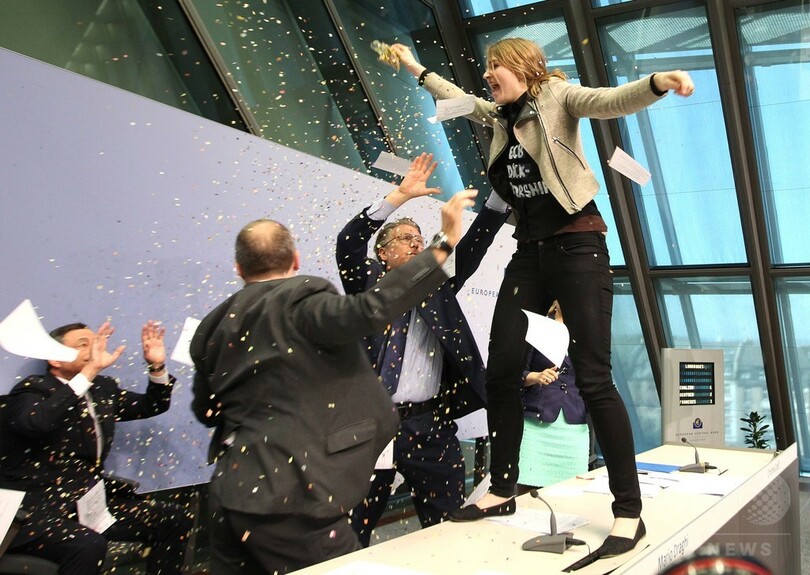 【4月16日 AFP】ドイツ・フランクフルト(Frankfurt)の欧州中央銀行(ECB)新本部で15日、マリオ・ドラギ(Mario Draghi)総裁の記者会見中に若い女性が乱入し、「ECBの独裁を終わらせろ」などと叫んで会見を一時中断させる騒ぎがあった。