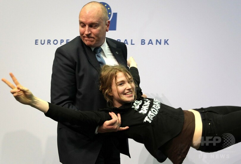 【4月16日 AFP】ドイツ・フランクフルト(Frankfurt)の欧州中央銀行(ECB)新本部で15日、マリオ・ドラギ(Mario Draghi)総裁の記者会見中に若い女性が乱入し、「ECBの独裁を終わらせろ」などと叫んで会見を一時中断させる騒ぎがあった。