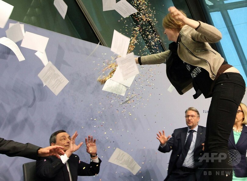 【4月16日 AFP】ドイツ・フランクフルト(Frankfurt)の欧州中央銀行(ECB)新本部で15日、マリオ・ドラギ(Mario Draghi)総裁の記者会見中に若い女性が乱入し、「ECBの独裁を終わらせろ」などと叫んで会見を一時中断させる騒ぎがあった。