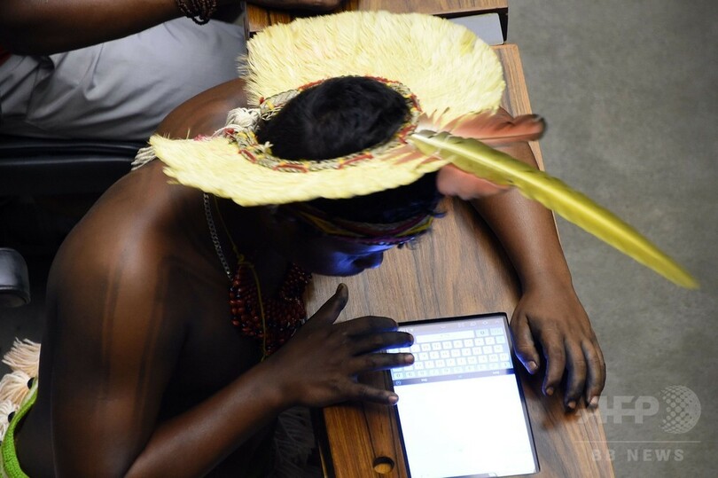 【4月18日 AFP】ブラジルの首都ブラジリア(Brasilia)の同国議会で16日、先住民たちが権利を要求する「ナショナル・モビライゼーション・ウイーク(National Mobilization Week)」の一環として先住民をたたえる会議が開かれ、多くの先住民が参加した。(c)AFP
