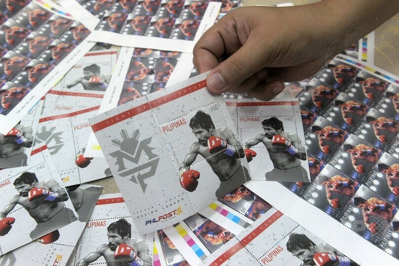 政府機関もまた、パックマニアの熱狂に押し流されており、郵便局では今週、リングで戦うパッキャオの写真が印刷された記念切手を50万枚売り出す予定となっている。(c)AFP