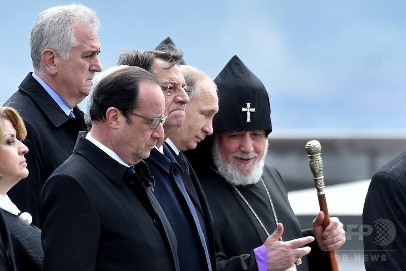 【4月25日 AFP】100年前に起きたオスマン帝国軍によるアルメニア人約150万人の虐殺の犠牲者を追悼する式典が24日、アルメニアの首都エレバン(Yerevan)で行われ、フランスやロシアなど約60か国の首脳や外交官らが出席した。しかしエレバンの丘の上で行われた記念式典では、アルメニア人虐殺が現在も外交上の「地雷原」であることが垣間見えた。
