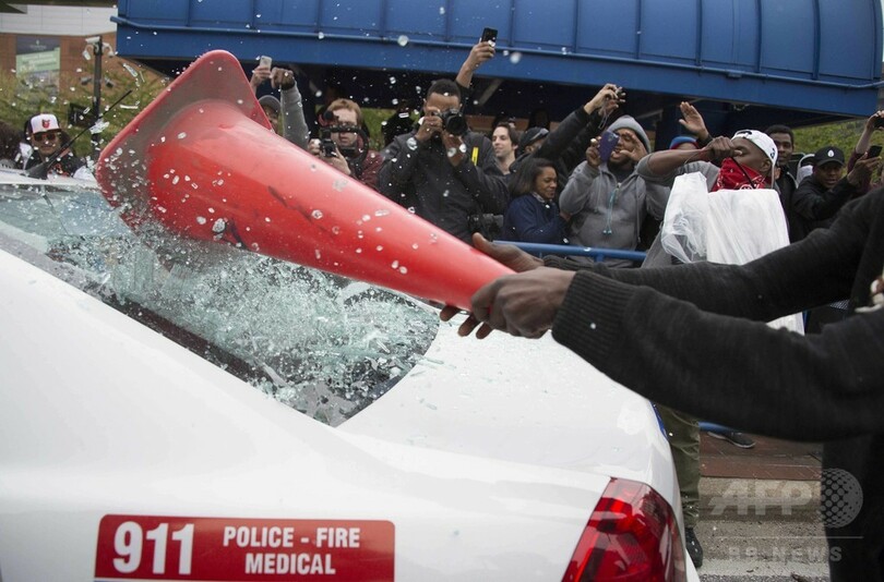 【4月26日 AFP】米メリーランド(Maryland)州ボルティモア(Baltimore)で25日、黒人青年のフレディ・グレイ(Freddie Gray)さんが警察に取り押さえられた際に頸部(けいぶ)を負傷して死亡したことに抗議する大規模な集会が行われたが、一部の参加者が暴徒化し、警察車両や商店の窓を破壊した。