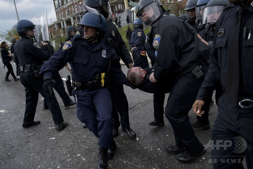 【4月28日 AFP】(写真追加)米メリーランド(Maryland)州ボルティモア(Baltimore)で27日、今月警察に拘束された際に死亡した黒人青年フレディ・グレイ(Freddie Gray)さん(25)の葬儀が行われた後、黒人に対する警察の対応に抗議する住民らが暴徒化し、複数の車両が破壊された他、店舗も略奪された。同州のラリー・ホーガン(Larry Hogan)知事は非常事態を宣言し、州兵を動員した鎮圧に乗り出した。