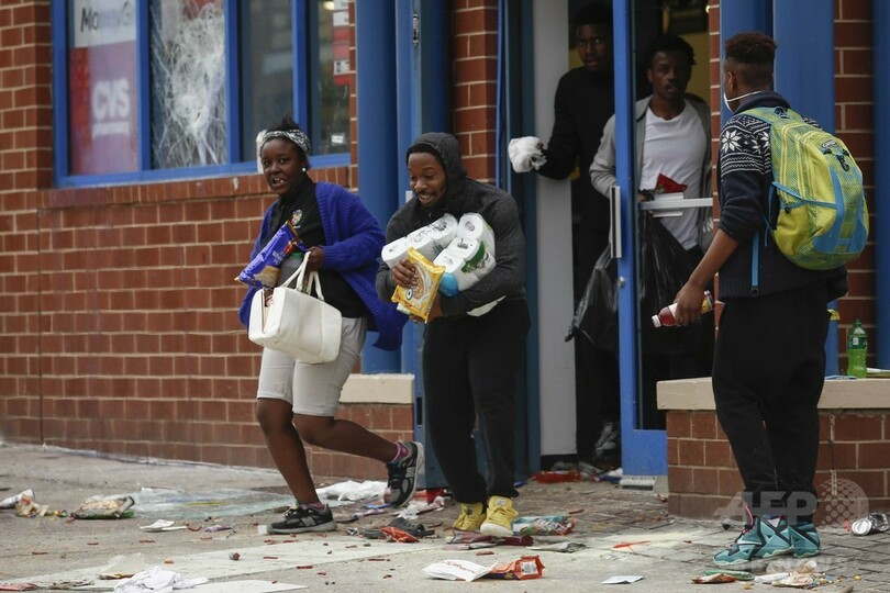【4月28日 AFP】(写真追加)米メリーランド(Maryland)州ボルティモア(Baltimore)で27日、今月警察に拘束された際に死亡した黒人青年フレディ・グレイ(Freddie Gray)さん(25)の葬儀が行われた後、黒人に対する警察の対応に抗議する住民らが暴徒化し、複数の車両が破壊された他、店舗も略奪された。同州のラリー・ホーガン(Larry Hogan)知事は非常事態を宣言し、州兵を動員した鎮圧に乗り出した。