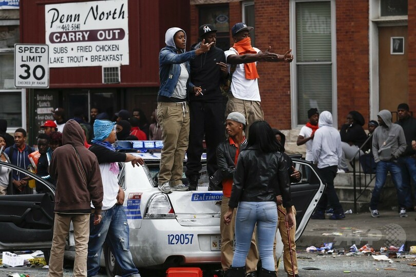 【4月28日 AFP】(写真追加)米メリーランド(Maryland)州ボルティモア(Baltimore)で27日、今月警察に拘束された際に死亡した黒人青年フレディ・グレイ(Freddie Gray)さん(25)の葬儀が行われた後、黒人に対する警察の対応に抗議する住民らが暴徒化し、複数の車両が破壊された他、店舗も略奪された。同州のラリー・ホーガン(Larry Hogan)知事は非常事態を宣言し、州兵を動員した鎮圧に乗り出した。