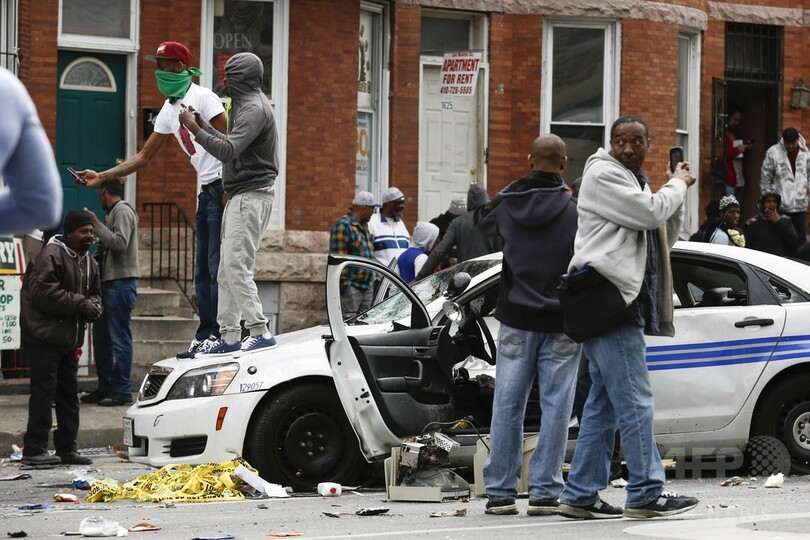 【4月28日 AFP】(写真追加)米メリーランド(Maryland)州ボルティモア(Baltimore)で27日、今月警察に拘束された際に死亡した黒人青年フレディ・グレイ(Freddie Gray)さん(25)の葬儀が行われた後、黒人に対する警察の対応に抗議する住民らが暴徒化し、複数の車両が破壊された他、店舗も略奪された。同州のラリー・ホーガン(Larry Hogan)知事は非常事態を宣言し、州兵を動員した鎮圧に乗り出した。