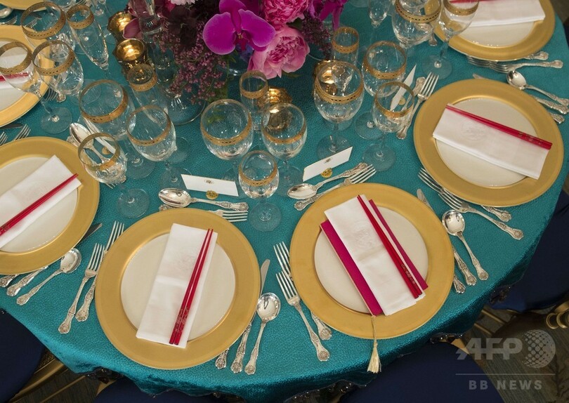 夕食会では、私設非営利団体White House Historical Associationが運営する財団White House Endowment Trustからの特別な寄付金を使って用意された食器、通称「オバマ食器」が初めて利用される。(c)AFP